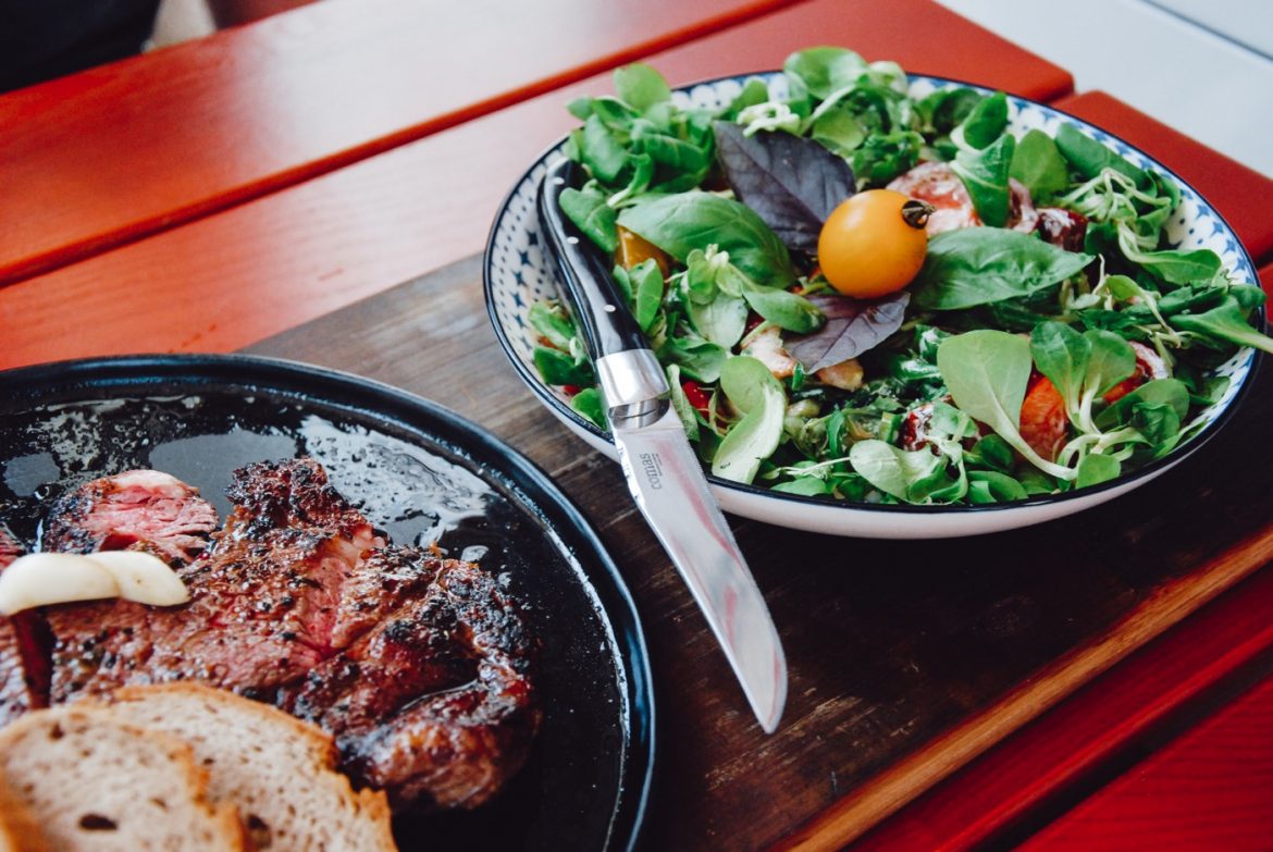 Abschließend sollte ich noch erwähnen, dass uns unsere Gerichte wirklich super geschmeckt haben. Eine wirklich gute Hühnersuppe bekommt man nur selten. Diese war wirklich sehr fein abgeschmeckt, kräftig und getoppt mit zartem Fleisch. Auch das Steak war ein Genuss (wir haben bisher kein besseres in der Stadt finden können). Der Salat, der dazu gereicht wurde, sah nicht nur fabelhaft aus, sondern schmeckte ebenfalls hervorragend. Wir haben unser Lunch im Gastgarten vom “Meat & Eat” sehr genossen und kommen auf jeden Fall wieder. Bravo!