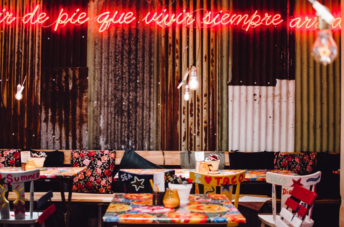 Vor allem, weil es hier so unglaublich cool ist! Ja, cool ist definitiv das richtige Wort. Bei der Einrichtung wurde richtig Gas gegeben. Die ausgefallenen Möbel stammen aus Antwerpen, wie zum Beispiel die bunten Holzstühle, die mit Aufschriften à la “I love Burritos” verziert sind. An der Wand hängt ein großes Leuchtschild mit dem Spruch “if you are looking for fairy tales, go to fucking Disneyland” (dt.: Falls du auf der Suche nach einem Märchen ist, dann geh ins verdammte Disneyland). Provokant und unkonventionell, dabei aber auf gar keinen Fall unsympathisch, sondern ehrlich und weltoffen!